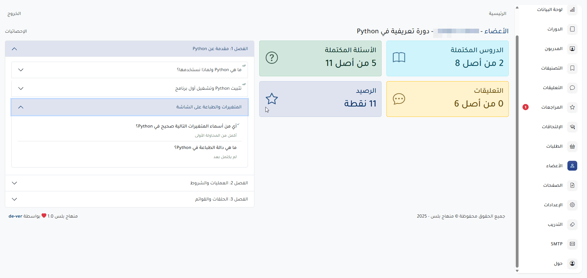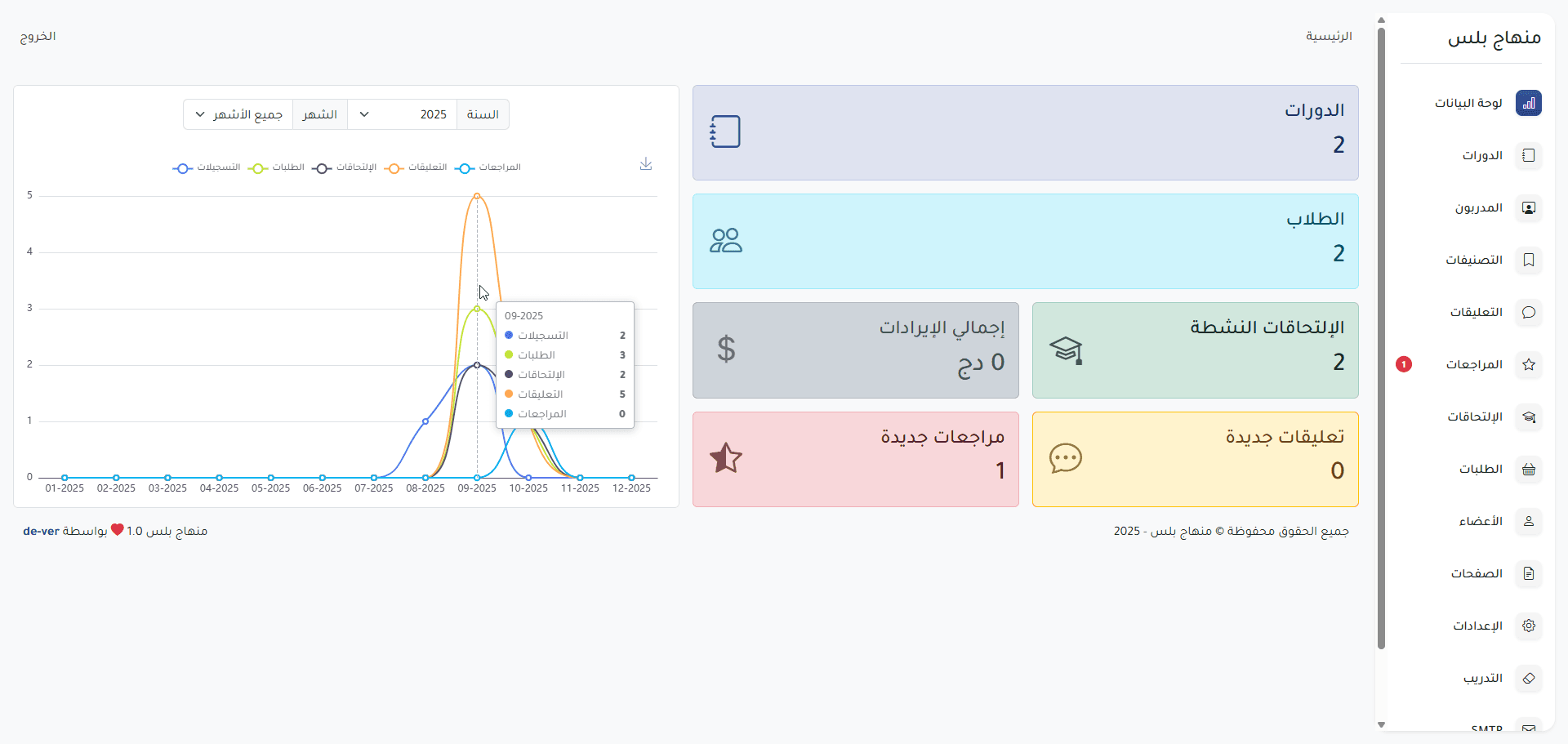 يتميز النظام بلوحة تحكم قوية، واجهة استخدام سلسة، ونظام إحصائيات متقدم يعرض نسب التقدم والإنجاز لكل طالب ودورة.