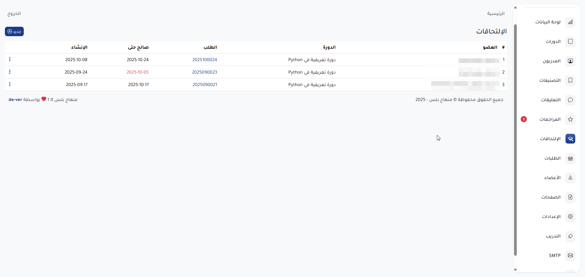 - ادارة وإنشاء الإلتحاقات والإشتراكات يدويا أو إيقافها.