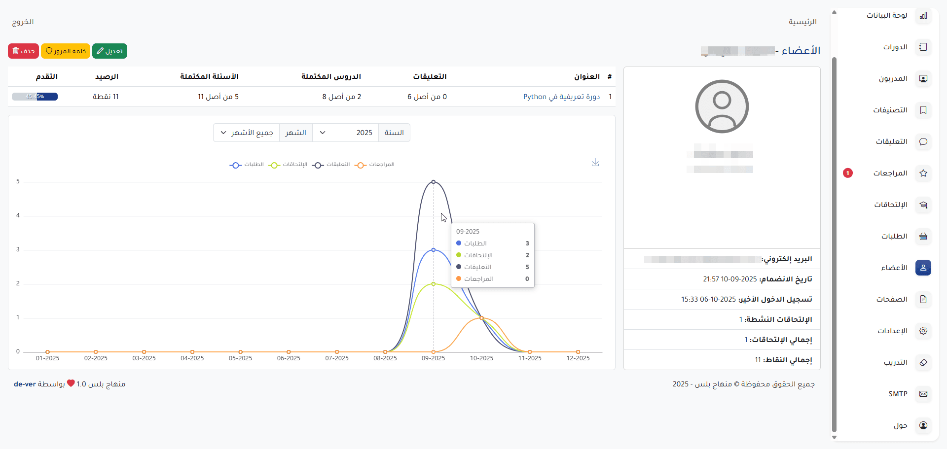 تتبع تفصيلي لكل طالب: عرض بياناته، نشاطه، ونسبة تقدّمه في كل كورس.