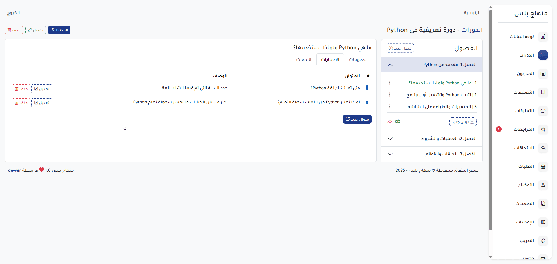 باختصار، قسم إدارة الكورسات في منهاج بلس يوفر مرونة لا مثيل لها في تنظيم المحتوى التعليمي، مع أدوات قوية لضمان تجربة تعلم احترافية وآمنة للطلاب، وتحكم كامل للمدرس أو المسؤول في كل جانب من جوانب الكورس.